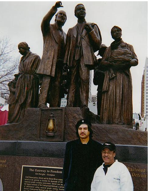 Astronaut Ed Dwight: Flight Surgeon Dr. Lewis Milburn was deputy director of Aerospace Medicine (Astronaut Dr. Mae C. Jemison NASA Medical Science tradition) when Dwight became the first Black astronaut trainee at N.A.S.A. during the John F. Kennedy Presidency. A generation later, Dr. David Milburn and Sculptor Ed Dwight standing in front of Dwight’s “magnum opus” Underground Railroad Memorial Monument on Detroit’s riverfront Hart Plaza. Before a capacity crowd of Underground Railroad descendants participating in the Underground Railroad Families Historical Society’s “Memorial Ceremony”, dignitaries (Mayor Dennis Archer, Aretha Franklin) and descendants placed memorial wreaths of remembrance (Anniversary Celebration) at the riverfront Detroit- Windsor Underground Railroad Memorial Monuments.After the 1993 completion of Dwight’s Underground Railroad Battle Creek Memorial,Dr.David Milburn was instrumental in facilitating the concept of Detroit Windsor riverfront Memorial Monuments.
