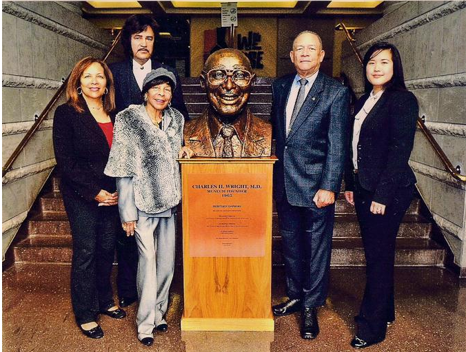 Dr. David Milburn was the recipient of Charles H. Wright Museum’s coveted “Honored Legacy,” chaired the Economic Development Committee during the building of Museum of African American History. Dr. Milburn standing to the left of his mentor’s Dr. Charles H. Wright bust, David Smedley’s masterpiece. Dr. Wright was a mentor to many in medicine and encouraged noblesse oblige, giving back to the community. Underground Railroad Descendants Dr. Barbara Smith, Dr. David Milburn, Dr. Roberta Wright of the Charles H. Wright Museum of African American History, Colonel Lawrence MIllben retired base commander of Selfridge Airbase, and Grace Doss.
