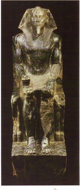 This extraordinary black statue of Pharaoh Khafre who built the 2nd pyramid at Giza is indisputably a great sculptural masterpiece. The majesty of its pose, the perfection and the subtle Masonic symbolism of its components parts, make it an ideal manifestation of the Old Kingdom’s theocratic monarchy. By legend, the Great Sphinx was made in Pharaoh Khafre’s image, whose power was so complete his Empire stretched from Central Africa thru Southern Europe into India. Pharaoh Khafre was titled revered “Emperor of the World.”
