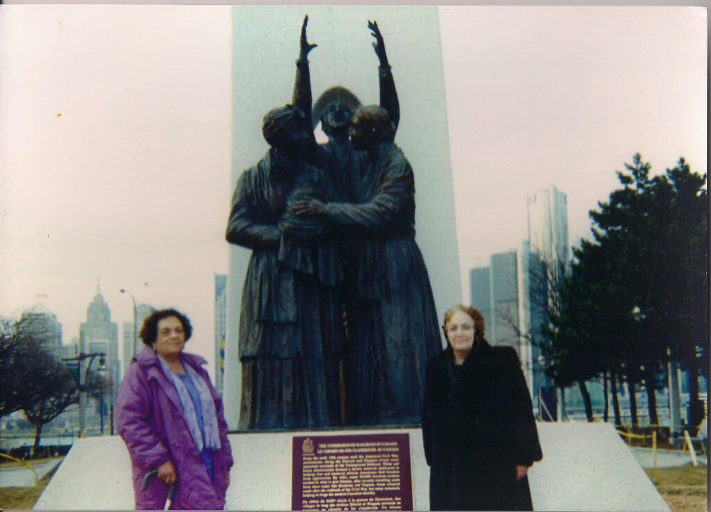 Underground Railroad Descendants sisters Windsorites Marie Thompson-McCurdy (Dr. George W.F McCurdy) and Ada Thompson Milburn (Dr. Lewis H. Milburn) review Windsor Ontario Tower of Freedom Underground Railroad Monument.