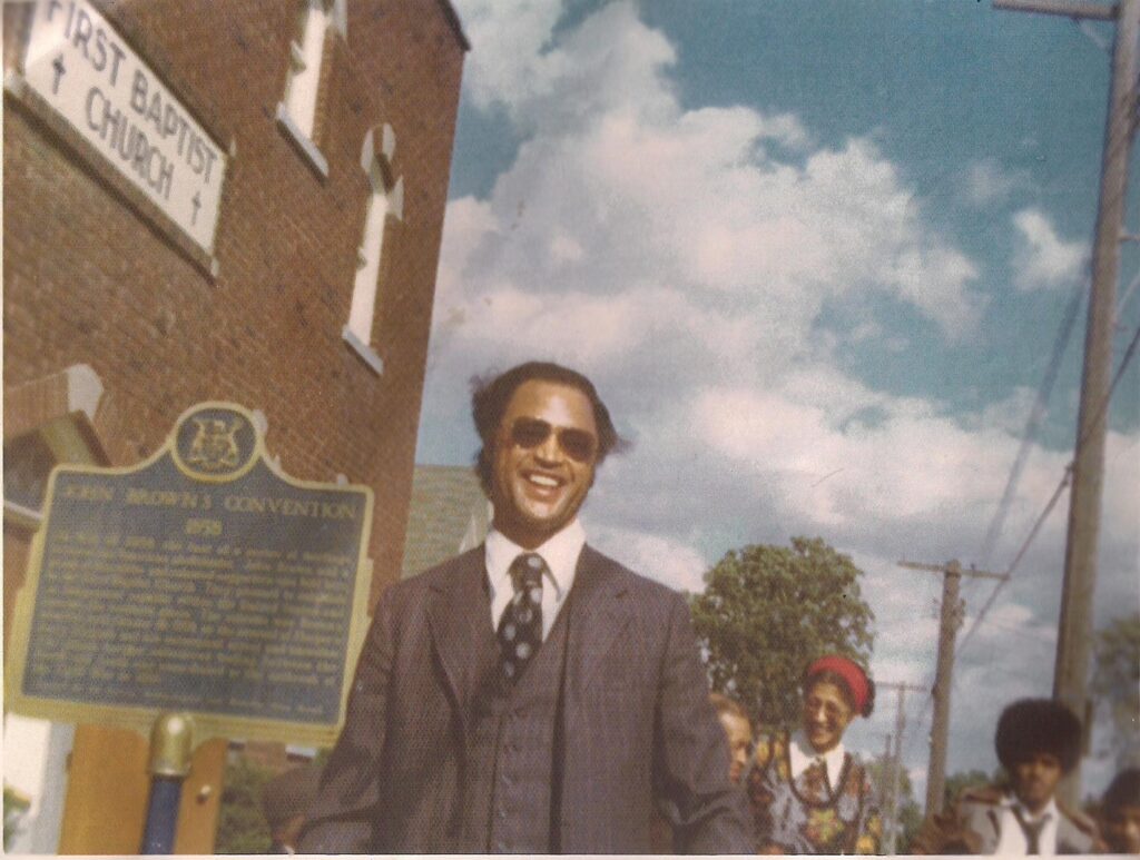 Honoree late Dr. Lewis Milburn standing in front of First Baptist Church. Dr. Milburn’s ancestors provided a protected sanctuary in Chatham, Ontario for a meeting of abolitionists including Frederick Douglass and John Brown this historical meeting helped precipitate the Civil War and Emancipation. Dr.Milburn toured Buxton National Historic Site Museum,attended several Buxton Labor Day (Underground Railroad Families) Homecomings.