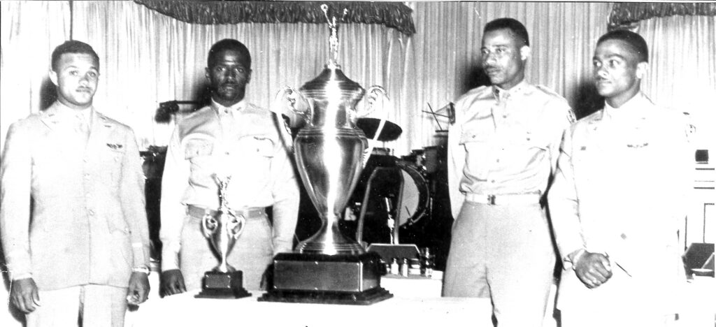 Lt. Halbert Alexander, Lt. James Harvey, Capt. Alva Temple, and Lt. Harry Stewart pictured here with the First Annual United States Air Force (USAF) Fighter Gunnery Meet First Place Trophy “Top Gun” awarded to Tuskegee Airmen.